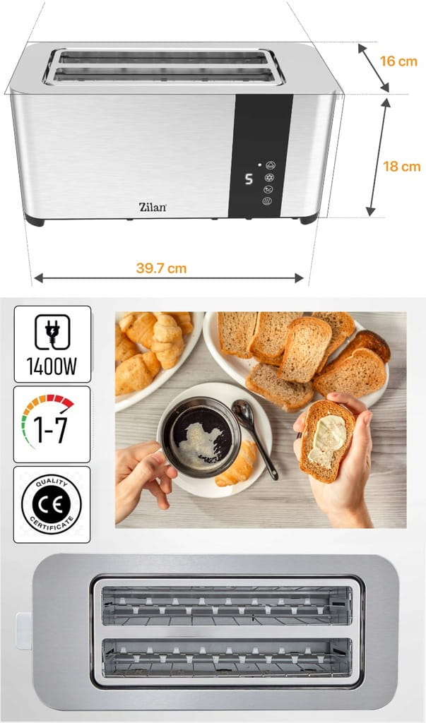 Odkryj nową jakość przyrządzania śniadań z tosterem ZILAN na DWIE KROMKI . Ciesz się preferowanym stopniem wypieczenia dzięki 7 POZIOMOM OPIEKANIA. Całość dopełnia ELEGANCKI, NOWOCZESNY DESIGN, który będzie idealnym dopełniniem każdej kuchni.